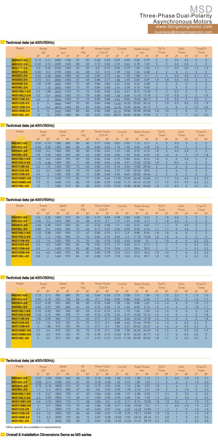 MSD Series Three-Phase Double Speed Asynchronous Motors are extending products of MS Series motors. There are two polarities of 2/4; 4/8 in single winding, and 2/6; 2/8; 4/6;6/8 in double winding.