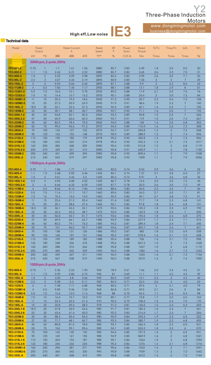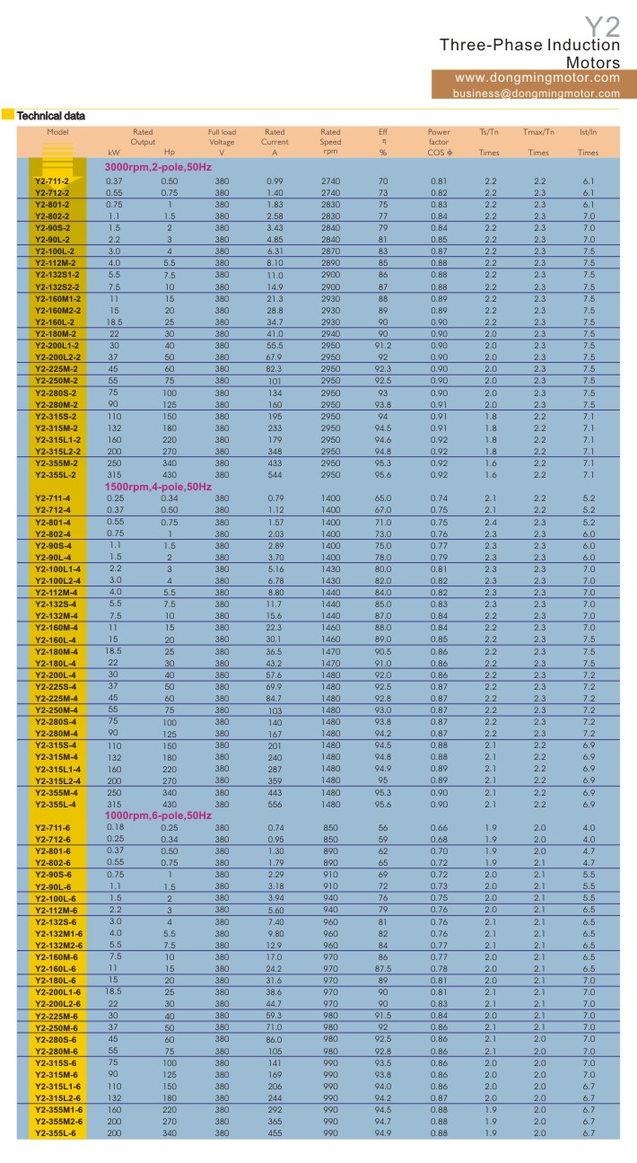 OPERATING CONDITIONS: Ambient temperature: -15℃<θ<40℃ Altitude: Not exceeding 1000meters Rated voltage: 380V or any voltage between 220~760V Rated frequency: 50Hz、60Hz Duty/Rating: Continuous(S1) Protection class: IP44、IP54、IP55 Insulation class: Class F、H、B Cooling method: IC0141 Connection: Star-connection for up to 3kW,delta-connection