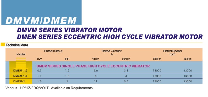 DMEM Series eccentric high cycle vibrator motor are enclosed in plastic housing and simple construction, which with pleasant appearances resulted from latest design. This series of vibrator motors are made of selectec quality materials supported by advanced techniques and science, and achieves the reputation of high performance, realiable operation, while remian the easy mantainance, low noises, little vibration and light weight.DMEM series vibrator motors are suitable for the occasion where big starting torque high overload and high rotating speed are required. It serves perfectly with other equipments operated on construction site and other hard working environments, such as motivating the concrete vibrator.