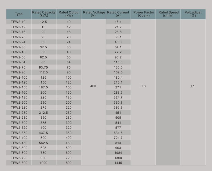 TFW2 Series brushless three-phase A.C. Synchronous generator import, digest and absorb international advance technology of manufacturing electric machinery. It’s the new-rype designed and developed A.C. synchronous generator by ourselves. The series generators accord with most of international standards. They also accord with the following standards: International Electrician Committee Command Standard IEC34 International Standardization Organization Command Standard ISO8528 NEMA Standard The products have outstanding performance, reliable quality, convenient maintenance. The generator and the engine can be connected with steel or flexible material. As a small-type generating station, it can be used in factories, buildings and worksites for lightening and electric power source.