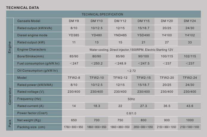 DM-YANGDONG series diesel generator sets, adopt 3 or 4 cylinders series engines produced by Yangdong Company Ltd., With our newest design brushless alternators/generators. The gensets already got the approval of EPA, and have more good performances with : low fuel/oil consumption, high reliability, low noise, light weight etc. (Could be made as soundproof silent type)